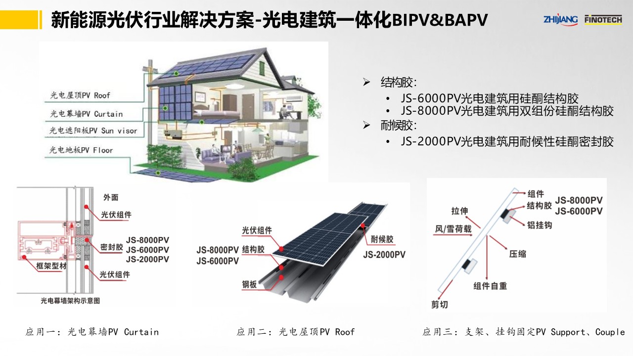 之江公司依托密封膠領(lǐng)域多年的創(chuàng)新平臺(tái),推出了優(yōu)異的光伏行業(yè)用膠解決方案以及光電建筑一體化解決方案,開(kāi)發(fā)出了性能優(yōu)異的JS-6000PV/JS-8000PV光電建筑用結(jié)構(gòu)膠、JS-2000PV光電建筑用耐候膠等有機(jī)硅系列品種,應(yīng)用于光電建筑幕墻、光電屋頂、組件掛鉤粘接等方面。