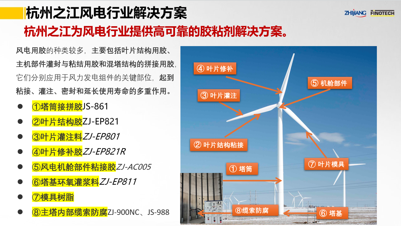杭州之江作為國內(nèi)領先的膠黏劑密封膠生產(chǎn)企業(yè),為全球提供風電行業(yè)解決方案及一體化服務,不斷通過產(chǎn)品系統(tǒng)創(chuàng)新,高質(zhì)量推動雙碳目標的實現(xiàn)。
